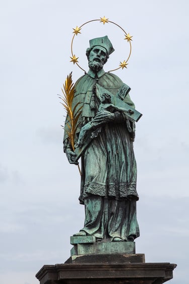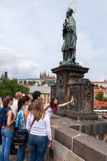 Besondere Aufmerksamkeit erhält die Figur des heiligen Johannes von Nepomuk, deren Verehrung eng mit der Legende seines Martyriums verbunden ist. An seinem Relief – es zeigt den Sturz des Heiligen von der Brücke in die Moldau – hat sich im Laufe der Zeit eine populäre Praxis entwickelt: Das Berühren der Metalloberfläche soll Glück bringen oder Schutz erbitten. Entsprechende Glättungs- und Polierspuren an den berührten Stellen belegen die massenhafte Wiederholung dieser Geste über Generationen hinweg. Die Handlung ist nicht liturgisch kanonisiert, sondern Ausdruck einer volkstümlichen Religiosität, in der sakrale Symbolik und touristische Ritualisierung miteinander verschmelzen.