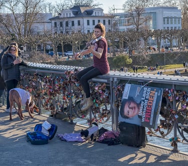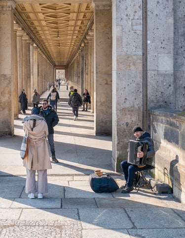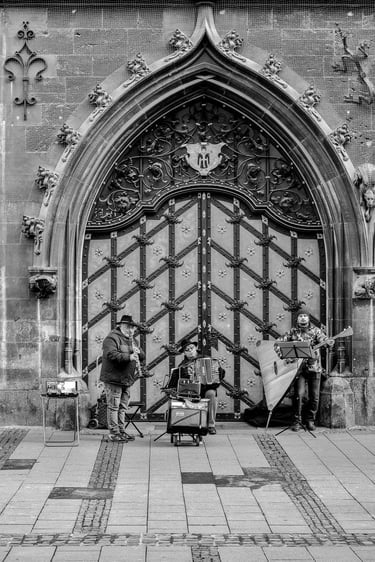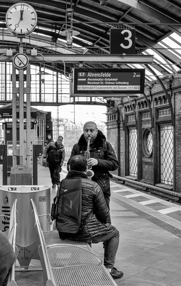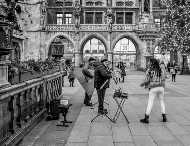 Die auf dieser Seite versammelten Fotografien sind im Rahmen meiner Stadtfotografie entstanden. Im Zentrum stehen Personen, die mit ihren Instrumenten im öffentlichen Raum auftreten und auf diese Weise Teil des alltäglichen urbanen Geschehens werden. Die Aufnahmen dokumentieren unterschiedliche musikalische Praktiken und Situationen – von spontanen Darbietungen bis zu festen Standorten in Fußgängerzonen oder auf Plätzen. Straßenmusik erscheint dabei als integraler Bestandteil großstädtischen Lebens und wird als solcher fotografisch festgehalten. Es handelt sich nicht um sogenannte Street Photography im engeren Sinne, sondern um einen spezifischen Aspekt dokumentarischer Stadtfotografie.