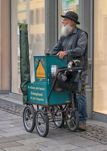 Unter den Porträtierten befindet sich auch ein Leierkastenmann. Sein Instrument verweist auf eine lange Tradition der Straßenmusik, die bis in das 19. Jahrhundert zurückreicht. Ein bekanntes Bildmotiv ist der Leierkastenmann im Hinterhof der Berliner Mietskaserne, wie er in den Zeichnungen von Heinrich Zille erscheint. Zeitgenössische Entsprechungen finden sich in den Musikerinnen und Musikern der Berliner S- und U-Bahnen, die mitunter in Gruppen auftreten und den akustischen Raum mit erheblicher Lautstärke prägen.