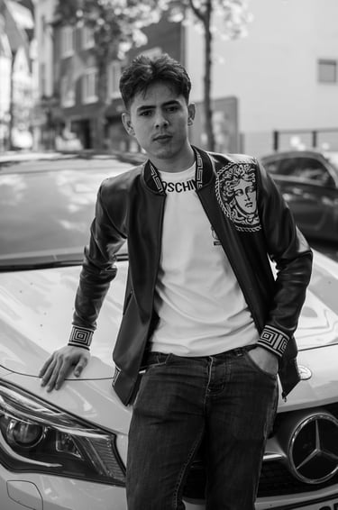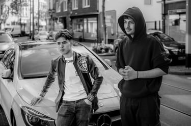 Mit unseren Freunden Lothar und Klaus Peter aus Berlin waren wir in Duisburg-Ruhrort unterwegs. Der junge Mann mit dem Kapuzenpulli sprach mich an und fragte, ob ich seine beiden Freunde, die aus London zu Besuch seien, fotografieren würde. Alle drei stammen aus Syrien und waren nach Europa geflüchtet. Als ich die Porträts gemacht hatte und sie auf dem Display der Kamera zeigte, war die Enttäuschung groß. Die Fotos der Leica Monochrom waren "nur" in schwarzweiß. Zum Glück hatte Lothar eine "richtige" Kamera dabei und startete eine kleine Fotosession, bei der die Jungens auch einen geparkten weißen Mercedes einbezogen.