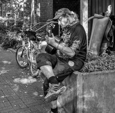 Im Stadtteil Hochfeld sind meine Frau und ich oft mit den Kameras unterwegs. Bei einem unserer Spaziergänge sprach mich dieser Mann am Kiosk Brückenplatz sehr höflich an: "Entschuldigung, darf ich Sie ganz höflich etwas fragen?". Ich hatte damit gerechnet, dass er um einen Euro bitten würde, aber er fragte, ob ich ein Foto von ihm machen würde. Das habe ich gerne gemacht. Als ich es eine Woche später verabredungsgemäß am Kiosk abgeben wollte, traf ich den Mann wieder. Er war mit dem Ergebnis sehr zufrieden.