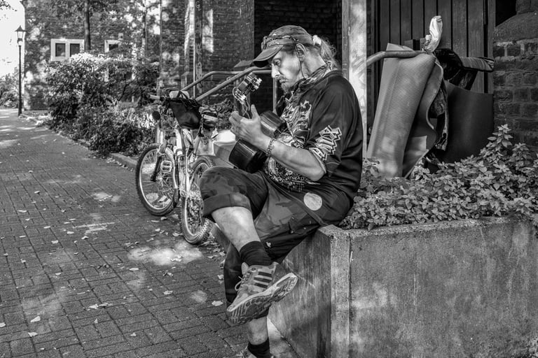 Auf dem Weg von der Innenstadt zu unserer Wohnung bemerkte ich diesen Mann. Er hatte wahrscheinlich keine Wohnung und war mit dem Fahrrad unterwegs. Auf einem kleinen Anhänger hatte er seinen Besitz verstaut. Die Nacht hatte er unter einem Vordach am Seiteneingang der Kirche St. Joseph verbracht. Dort saß er am frühen Morgen und spielte auf der Gitarre. Ich holte meine Leica und ging wieder an den Ort zurück. Der Mann spielte immer noch. Ich deute durch Gesten an, dass ich gerne fotografieren wollte. Er nickte mit dem Kopf und so entstanden diese drei Fotos.